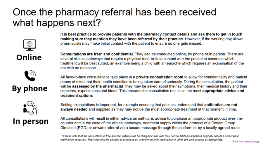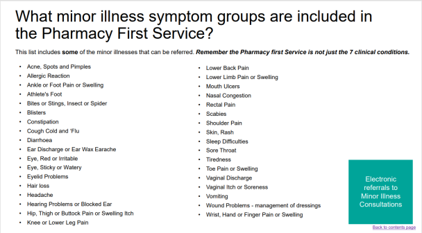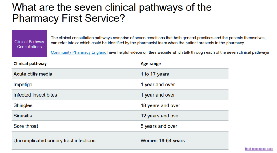 The Pharmacy First Service builds on the previous Community Pharmacist Consultation Service (CPCS) by enabling community pharmacies to manage patients for seven common conditions, following specific clinical pathways. The overal service consists of three core elements:
